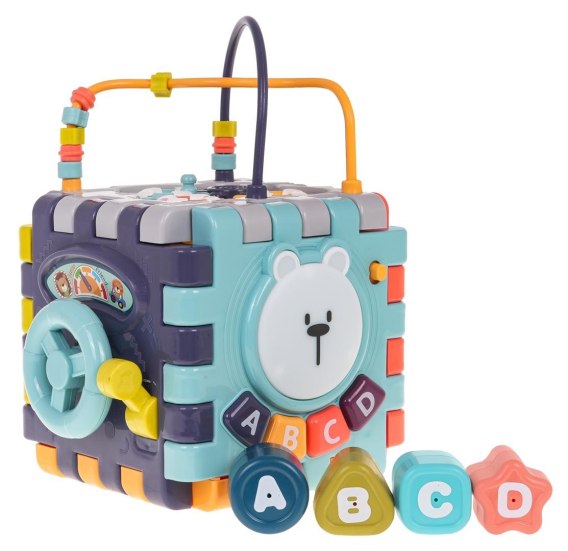 Wielofunkcyjna interaktywna kostka z efektami dźwiękowymi i świetlnymi dla dzieci od 18-go miesiąca życia. Każda ścianka boxu zapewni dziecku wiele frajdy i interaktywnej zabawy. Efekty dźwiękowe i świetlne oraz bogactwo kolorów, przyciągnie wzrok maluszka i zachęci do zabawy. Kostkę możemy rozkładać i bawić się poszczególnymi elementami na płasko. Zabawka zasilana jest bateriami typu 3 x AAA 1,5 V (brak w zestawie). Opis ścianek boksu: - ścianka z ruchomą kierownicą i ruchomą skrzynią biegów. Maluszek może poruszać kierownicą i atrapą drążka zmiany biegów.