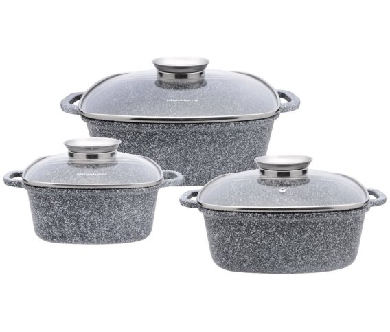 Komplet 3 garnków kwadratowych (brytfann) KLAUSBERG pokrytych ceramiczną marmurową powłoką nieprzywierającą z akcesoriami. Zestaw posiada pokrywki szklane z uchwytem Aroma Knob w którym umieszczono dozownik oleju, dzięki któremu podczas gotowania lub duszenia można podawać olej lub płynne przyprawy. Garnki wykonane ze stopu aluminium posiadają indukcyjne ferromagnetyczne dno. Są przystosowane do współpracy z każdym rodzajem kuchni, włącznie z indukcyjną.