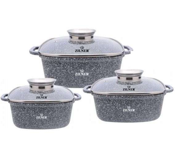 Komplet 3 garnków kwadratowych (brytfann) ZILNER / EDELHOFF pokrytych marmurową ceramiczną powłoką nieprzywierającą. Zestaw posiada pokrywki szklane z uchwytem Aroma Knob w którym umieszczono dozownik oleju, dzięki któremu podczas gotowania lub duszenia można podawać olej lub płynne przyprawy. Garnki wykonane ze stopu aluminium posiadają indukcyjne ferromagnetyczne dno. Są przystosowane do współpracy z każdym rodzajem kuchni, włącznie z indukcyjną.