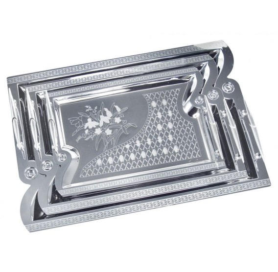 Zestaw 3 eleganckich tac do serwowania wykonanych z wysokiej jakości stali chromowanej polerowanej na wysoki połysk.