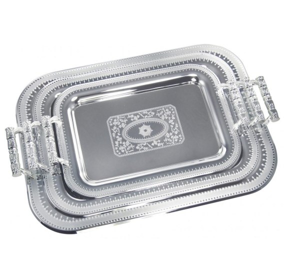 Zestaw 3 eleganckich tac do serwowania wykonanych z wysokiej jakości stali chromowanej polerowanej na wysoki połysk.