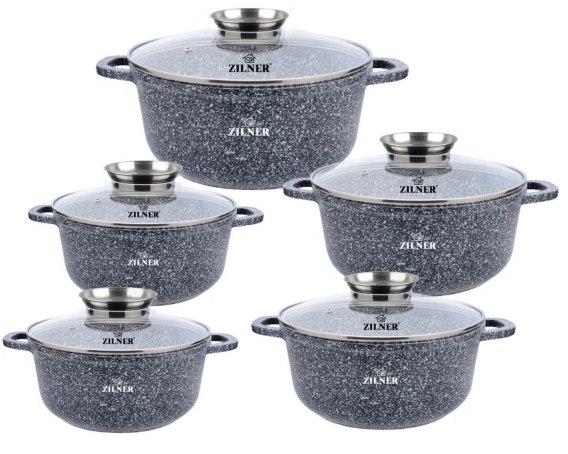 Komplet 5 garnków ZILNER pokrytych ceramiczno marmurową powłoką nieprzywierającą. Zestaw posiada pokrywki szklane z uchwytem Aroma Knob w którym umieszczono dozownik oleju, dzięki któremu podczas gotowania lub duszenia można podawać olej lub płynne przyprawy. Garnki wykonane ze stopu aluminium posiadają indukcyjne ferromagnetyczne dno. Są przystosowane do współpracy z każdym rodzajem kuchni, włącznie z indukcyjną.