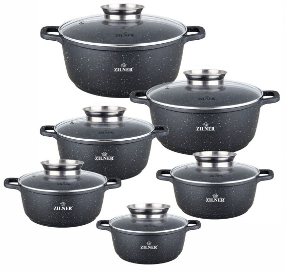 Komplet 6 garnków 16 / 20 / 20 / 22 / 24 / 28 cm ZILNER pokrytych marmurową powłoką nieprzywierającą.