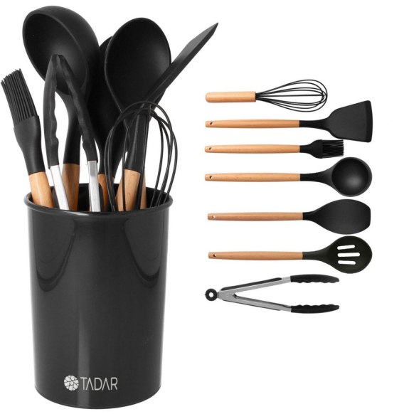 Zestaw 7 silikonowych przyborów kuchennych w stojaku TADAR SILICO PEMI. Część robocza każdego elementu wykonana jest z dobrej jakości silikonu, a uchwyty z z drewna bambusowego. Zestaw zawiera wszystko, czego będziesz potrzebować w kuchni. Korzystając z nich, nie uszkodzisz powłoki nieprzywierającej garnków lub patelni. Wykorzystane materiały są odporne na działanie wilgoci, wnikanie aromatów oraz przebarwienia.