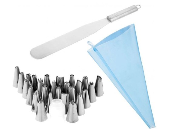 29 elementowy zestaw akcesoriów do dekorowania oraz nadziewania wyrobów cukierniczych zawierający rękaw, końcówki, szpatułę oraz wyciskacz ułatwiający wyciskanie masy z rękawa.