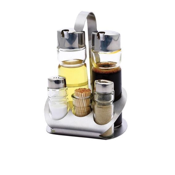 W zestawie znajduje się solniczka, pieprzniczka, 2 dozowniki do przypraw w płynie, pojemnik na wykałaczki i stojak.