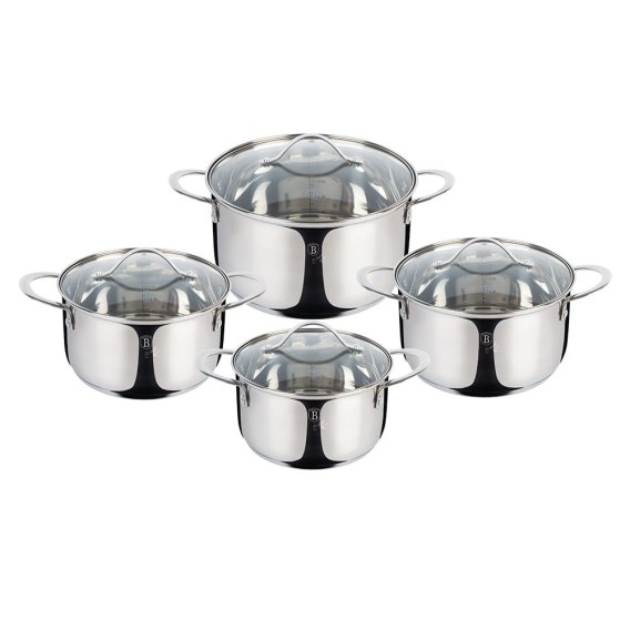 Zestaw garnków (8 elementów) firmy BERLINGER HAUS z linii Silver Jewellery z wielowarstwowym dnem akutermicznym wykonany z najwyższej jakości stali chromowo-niklowej. Stal chromowo-niklowa z której wykonano zestaw jest nierdzewna, wytrzymała i długowieczna. Zastosowany materiał świetnie się prezentuje i jest wyjątkowo łatwy w czyszczeniu oraz posiada właściwości bakteriobójcze. Wielowarstwowe dno akutermiczne (5mm) gwarantują doskonały rozdział i magazynowanie ciepła. Z uwagi na swoje wyjątkowe cechy garnki te nadają się również do gotowania z minimalną ilością wody i tłuszczu. Garnki można używać na wszystkich rodzajach kuchenek, także indukcyjnych. Nitowane uchwyty gwarantują długotrwałe i bezpieczne użytkowanie. Skala pomiarowa wewnątrz każdego garnka ułatwia dozowanie wymaganej ilości wody lub innych składników przygotowywanego dania.