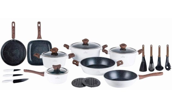 21-częściowy zestaw garnków z przyborami kuchennymi z nieprzywieralna powłoką marmurową firmy ZILNER z serii White Lilly