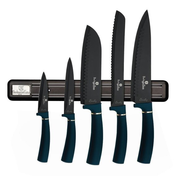 Zestaw noży 6 elementów firmy BERLINGER HAUS z serii AQUAMARINE. Noże ze stali nierdzewnej dodatkowo pokryte powłoką anty-przywierającą wysokiej klasy. Wyposażone w uchwyty pokryte bardzo trwałą cienką warstwą silikonu dla uzyskania pewnego trzymania w każdych warunkach. Całość znajduje się w efektownym pudełku kartonowym z wytłoczką z pianki, zamykana na magnes.
