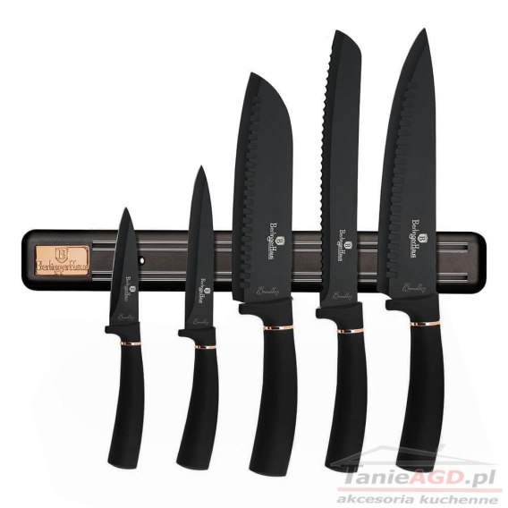Zestaw noży 6 elementów firmy BERLINGER HAUS z serii BLACK ROSE. Noże ze stali nierdzewnej dodatkowo pokryte powłoką anty-przywierającą wysokiej klasy. Wyposażone w uchwyty pokryte bardzo trwałą cienką warstwą silikonu dla uzyskania pewnego trzymania w każdych warunkach. Całość znajduje się w efektownym pudełku kartonowym z wytłoczką z pianki, zamykana na magnes.
