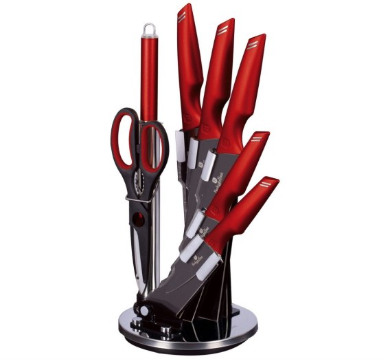 Zestaw noży na stojaku 8 elementów firmy BERLINGER HAUS z serii BURGUNDY. Noże ze stali nierdzewnej dodatkowo pokryte powłoką anty-przywierającą wysokiej klasy. Wyposażone w uchwyty pokryte bardzo trwałą cienką warstwą silikonu dla uzyskania pewnego trzymania w każdych warunkach. Całość na stojaku obrotowym wykonanym z błyszczącego akrylu. Noże pasują do serii naczyń z serii BLACK ROSE lub ROSE GOLD.