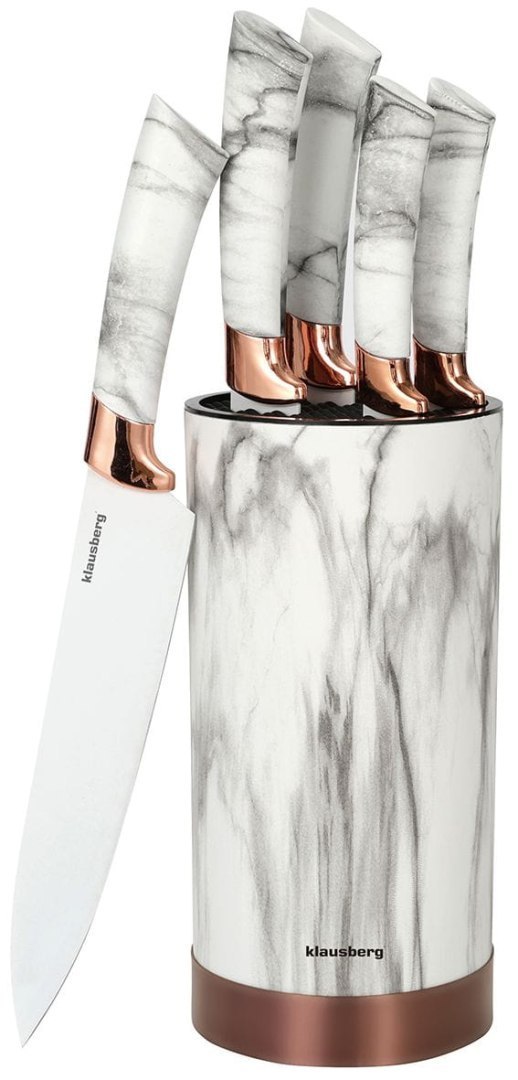 Marmurkowy wzór na rękojeściach i stojaku w połączeniu z białymi ostrzami i dekorami w odcieniu różowego złota dodatkowo podkreślają wyjątkowe wykończenie kompletu noży.