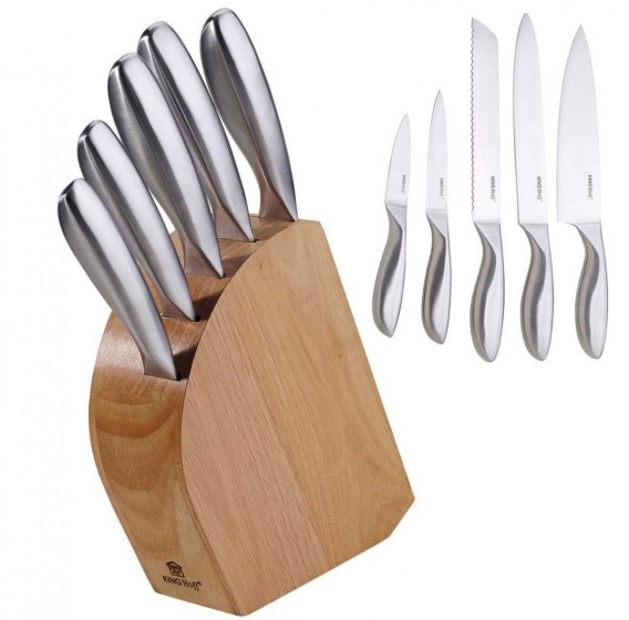 6 elementowy zestaw noży w bloku firmy KINGHOFF. Przeznaczone do porcjowania mięsa i ryb, krojenia pieczywa oraz obierania i siekania warzyw.