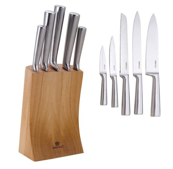 6 elementowy zestaw noży w bloku firmy KINGHOFF. Przeznaczone do porcjowania mięsa i ryb, krojenia pieczywa oraz obierania i siekania warzyw.