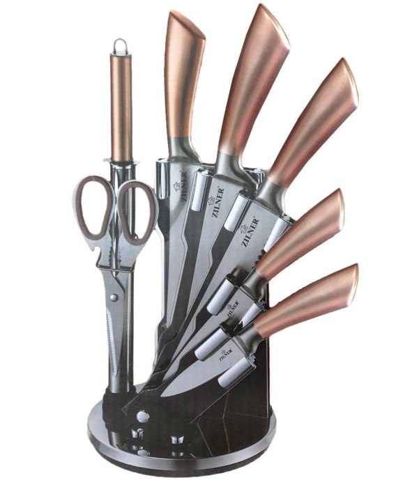 8 elementowy zestaw noży na stojaku firmy ZILNER z serii ROSEGOLD. Kompletny zestaw ogólnego przeznaczenia. Przeznaczone do porcjowania mięsa i ryb, krojenia pieczywa oraz siekania warzyw. Noże wykonane ze stali nierdzewnej chromowo-molibdenowej. Ostrza ze stali chromowo-molibdenowej są niezwykle twarde, odporne na odkształcenia, podatne na ostrzenie. Masywne z okładziną połyskującą w kolorze różowego złota.