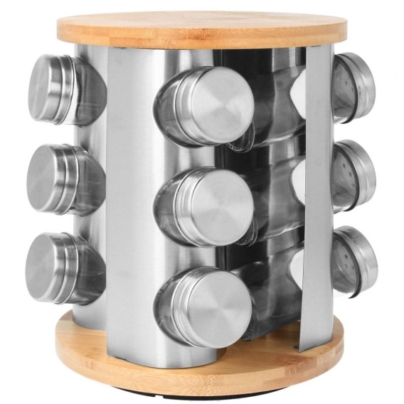 Zestaw 12 pojemników szklanych na obrotowym stojaku BRUNBESTE wykonany ze stali nierdzewnej w kolorze srebrnym połączonej z drewnem. Pojemniczki wykonane z grubego szkła, zamykane kapslem stalowym. Pod kapslem znajduje się zatyczka z dziurkami służąca do posypywania. Stojak obraca się na obrotowej podstawie wokół własnej osi 360 st.