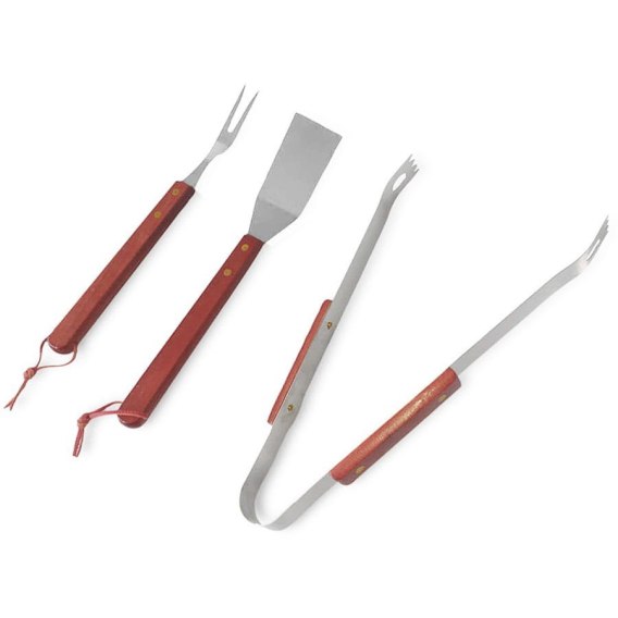 Zestaw przyborów do grilla 3 elementy wykonanych ze stali nierdzewnej z drewnianymi uchwytami.