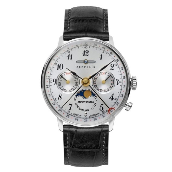 Zegarek Zeppelin Hindenburg 7037-1 to czasomierz o niebanalnym wyglądzie. Wyposażono go w stalową kopertę i czarny skórzany pasek. Siłą napędową czasomierza jest precyzyjny mechanizm kwarcowy. Na białej tarczy umieszczono datownik i wskaźnik faz księżyca. Cyferblat chroniony jest przez szkiełko hesalitowe. Wodoszczelność na poziomie 3ATM pozwala na drobne zachlapania. Zeppelin Hindenburg 7037-1 posiada 24-miesięczną gwarancję.