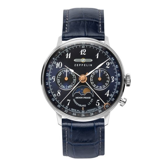 Zegarek Zeppelin Hindenburg 7037-3 to elegancki czasomierz, świetnie prezentujący się na męskim nadgarstku. Wyposażono go w kopertę wykonaną ze stali i czarny skórzany pasek. Siłą napędową zegarka jest precyzyjny mechanizm kwarcowy Ronda. Na granatowej tarczy umieszczono datownik i wskaźnik faz księżyca. Tarczę przykryto szkiełkiem hesalitowym. Wodoszczelność rzędu 3ATM pozwala na drobne zachlapania. Zegarek Zeppelin Hindenburg 7037-3 posiada 24-miesięczną gwarancję.