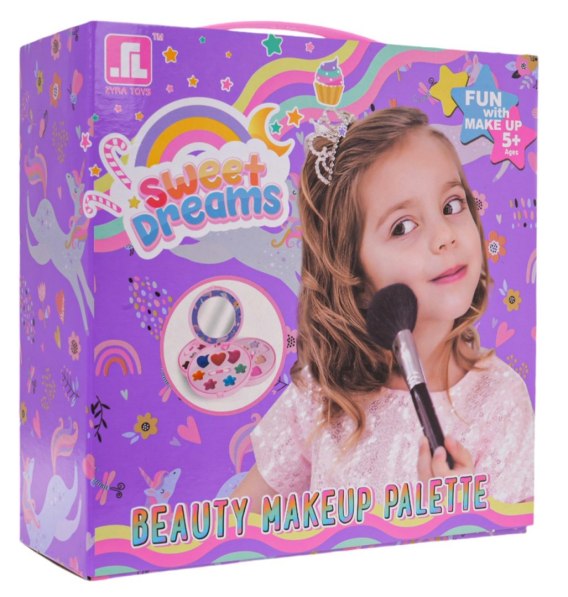 - szkatułka z kosmetykami, złożona ok. 5,5 cm x 12 cm średnicy, rozłożona ok. 13 cm x 20 cm, - dwustronne patyczki do cieni do powiek i pomadek ok. 4 cm długości, - mniejsze serduszka z cieniami do powiek i pomadkami do ust ok. 2,5 cm x 2,5 cm, - większe serduszka z cieniami do powiek i pomadkami do ust ok. 3,5 cm x 3,5 cm, - gwiazdki z pomadkami do ust z brokatem ok. 2,5 cm x 2,5 cm, - lusterko ok. 7,5 cm średnicy, - opakowanie ok. 19,5 cm x 19 cm x 8 cm. |