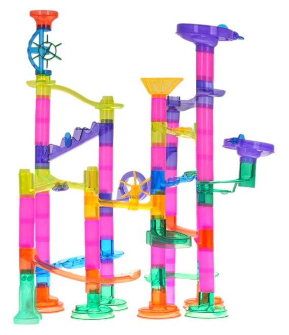 Kolorowy, wytrzymały, tor do samodzielnego montażu z kuleczkami dla dzieci od 3 - go roku życia. Zabawa polega na samodzielnym zbudowaniu konstrukcji toru, a potem puszczaniu piłeczek tunelami. Puszczanie w ruch kuleczek i obserwowania jak pokonuje kręte tunele, daje mnóstwo radości, uspokaja i wycisza. Zabawka pozytywnie wpływa na rozwój kreatywności, wyobraźni i zdolności manualnych. Mrugające kuleczki zasilane są bateriami łącznie 10 x LR41.
